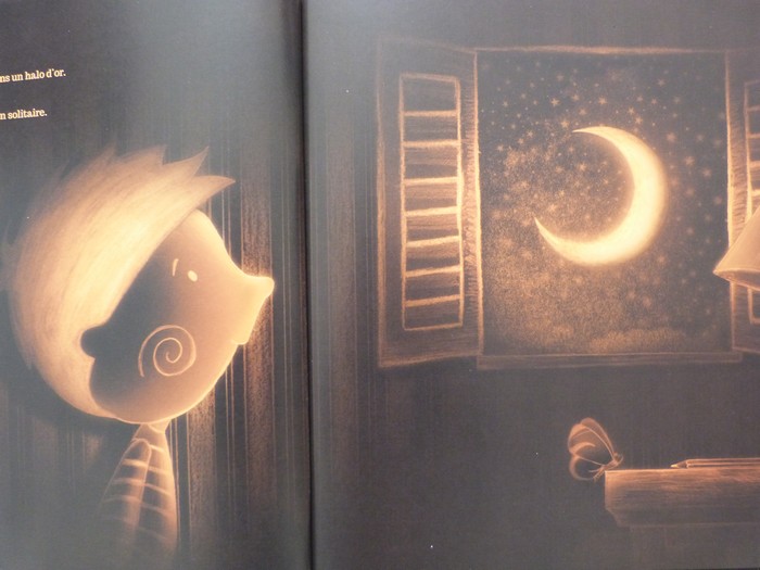 Un sublime album, adapté d’un court métrage de Rino Alaimo que vous pouvez voir ici. Les illustrations sont originales et belles à couper le souffle, utilisant exclusivement le noir et le doré, avec un fond étoilé sur toutes les pages. Le texte à des allures de conte, il est simple (l’album est accessible à partir de 4 ans environ) mais poétique et tendre. L’histoire rend hommage à l’extraordinaire beauté du monde et met en avant l’incroyable ténacité d’un petit garçon qui va réussir l’impossible, se faire aimer de la lune. Un petit bijou !